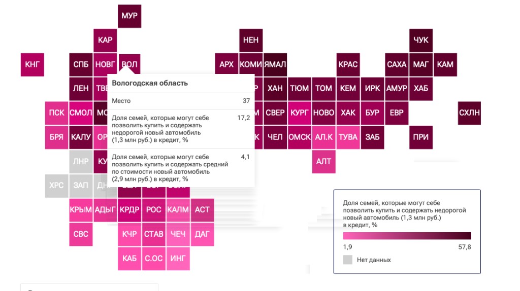 Верхние строчки рейтинга ожидаемо занял север богатых ресурсов: в Ямало-Ненецком автономном округе почти 58% семей могут купить автомобиль в кредит. А на самом последнем месте оказалась Ингушетия, где такую покупку может себе позволить меньше 2% жителей.
