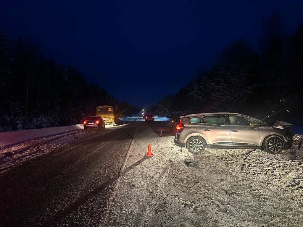 По предварительным данным, 38-летняя женщина за рулём «Рено» выезжала из села Первомайское и при перестроении не уступила дорогу школьному автобусу ПАЗ, который двигался прямо по своей полосе.