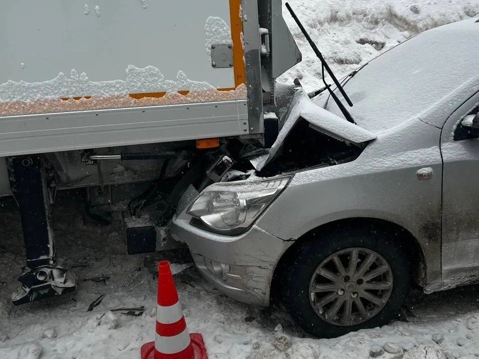 Легковой автомобиль Ravon, двигавшийся следом, начал экстренно тормозить, съехал на обочину и врезался во второй грузовик SITRAK, который ранее оказался в кювете.