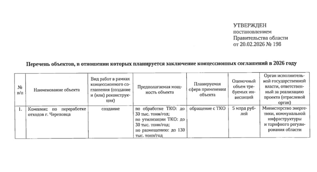Согласно постановлению Правительства Вологодской области №198 от 20.02.2026-го года, в текущем году планируется заключить концессионное соглашение только в отношении одного объекта – комплекса по переработке отходов города Череповца. Концессионер, с которым заключат договор, должен будет его создать.
