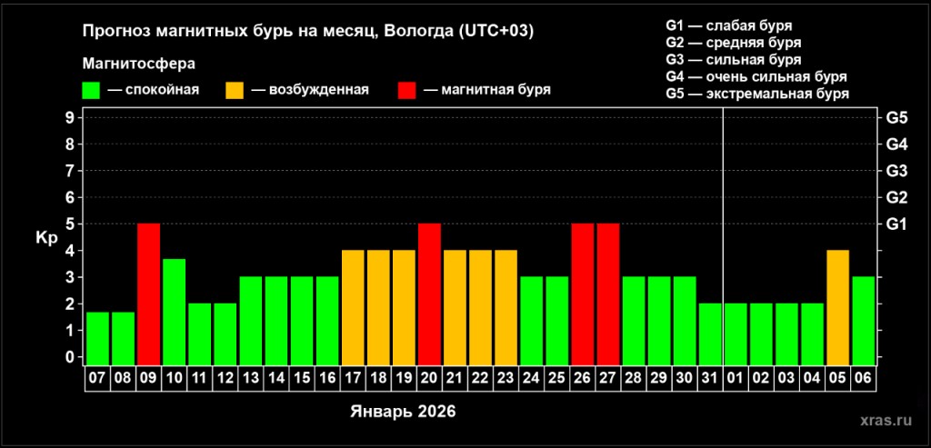 Наиболее напряжённый период ожидается во второй половине месяца. С 17 по 23 января в Вологодской области прогнозируется серия геомагнитных возмущений. В дни с 17 по 19 января и с 21 по 23 января уровень активности достигнет четырёх баллов. Самым тяжёлым днём станет 20 января, когда магнитная буря вновь усилится до уровня G1. Ещё один пик солнечной активности ожидается 26 и 27 января — в эти дни возможна пятибалльная магнитная буря.