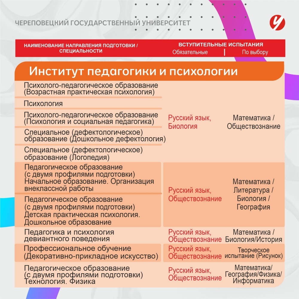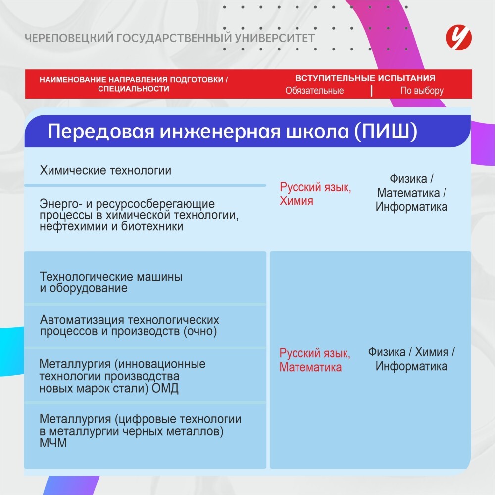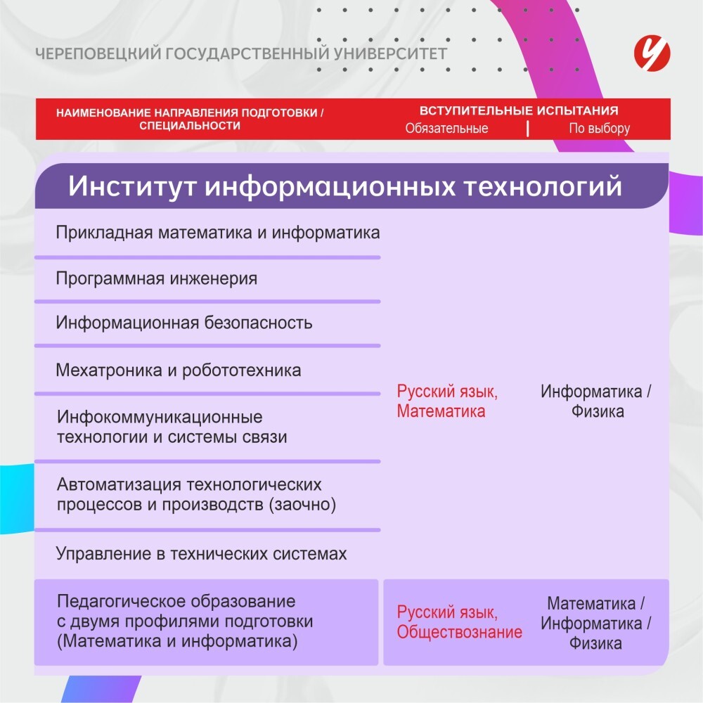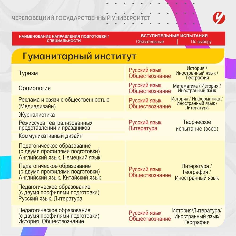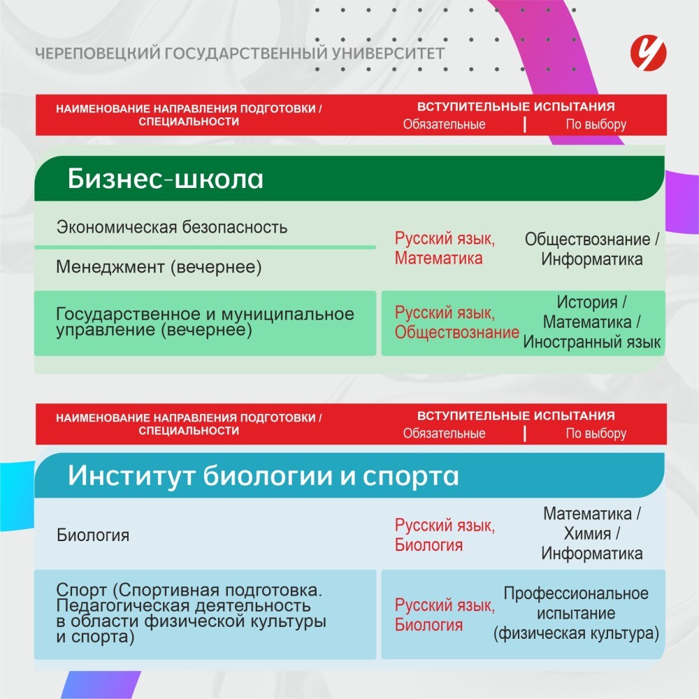 В карточках собрали информацию, какие экзамены нужны для поступления в Череповецкий государственный университет по разным направлениям.