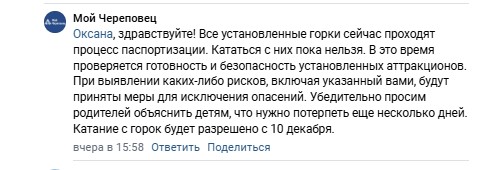 В мэрии Череповца оперативно отреагировали на такое обращение и разъяснили, что официального открытия городских горок еще не было. В настоящее время объекты проходят паспортизацию, поэтому кататься с них запрещено.