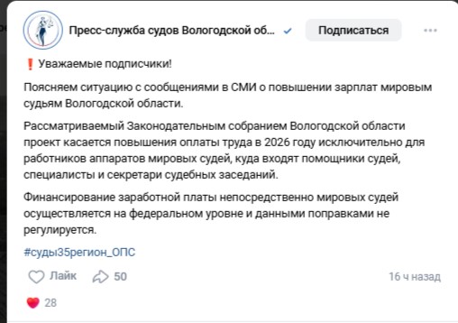 Впоследствии пресс-служба судов Вологодской области разместила пост-опровержение в своем официальном сообществе в социальной сети «ВКонтакте».