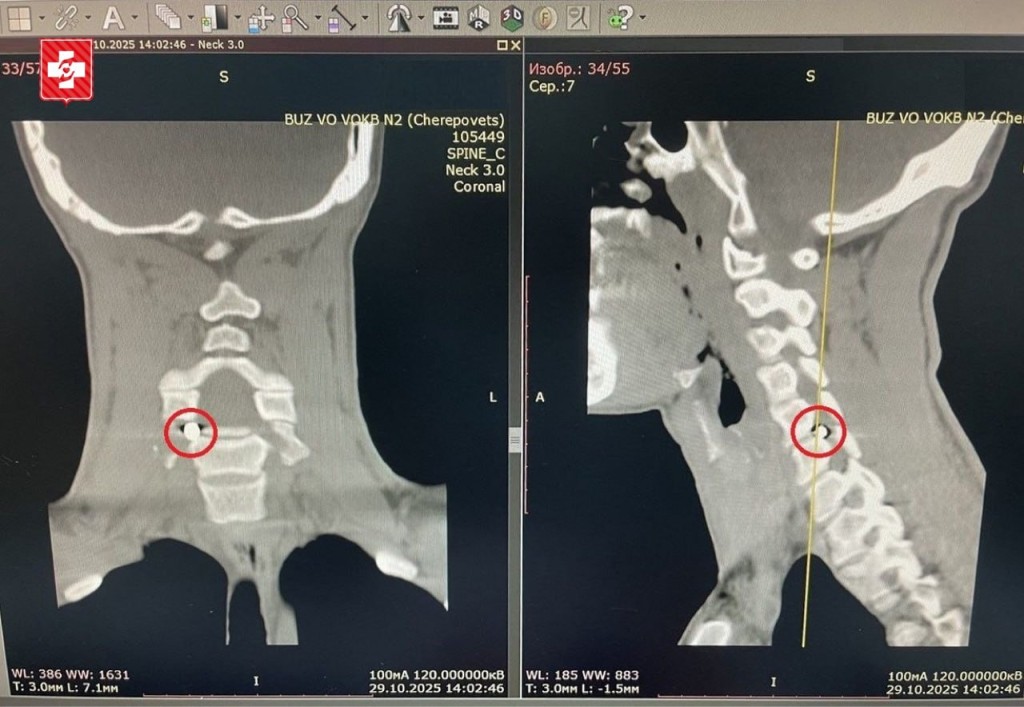 Нейрохирурги ВОКБ2 провели редкую по сложности операцию, вернув к нормальной жизни 41-летнего бойца СВО из Череповца. Мужчина в октябре получил множественное минно-взрывное ранение, и хотя на этапах эвакуации ему оказали первую медицинскую помощь, сильные боли в шее не прекращались. Обследование в приемном отделении областной больницы пролило свет на причину.